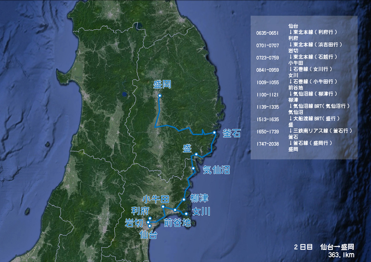 スマホのバイブで6時に起きる。決して快適とは言えないネカフェで寝たため身体はバッキバキ。ダラダラと支度し、すぐさま仙台駅へ向かう。この日も大して予定は決めていないのだが、とりあえず「さようなら江差線」のときにきちんと行けなかった利府支線を乗りに向かう。朝日を浴びた緑が目に優しい。利府にも岩切にも駅スタンプがなくちょっとテンションが下がる。利府支線に揺られながら、この辺りを攻めつつ三陸方面を回って盛岡まで行こうと決める。石巻線に乗るため小牛田へ。田舎なのに無駄にでかい駅舎がいいね。841時、小牛田を発った石巻線はホントーにのどかなワンマン気動車。終点へ近づくへつれ海がいい塩梅に広がってくる。女川では地元の祭りが行われているのか、わりと賑わいを見せていた。この駅もスタンプがないが、田舎の活気にココロオドル。また来た道を折り返し、今度は前谷地で気仙沼線に乗り換える。この路線は鉄路が途中で終わってしまうので柳津までの乗車となる。これまたのどか〜な田園地帯をえっちらおっちら進んでいく。