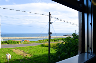 5時30分起床。あれほど走ったのに不思議とすんなり起きられた。旅の昂揚感がある。宿の名前が光陽館なだけに。若干の肌寒さはあるが、夏の朝日が心地よい。前日、宿のご主人が電話で予約してくれたタクシーも6時前にやってきた。阿分駅までと告げると、例の国道231号を悠然と下っていく。前日の夜は真っ暗で殆ど景色が分からなかったが、一面の海が朝日によく映えている。さほど間を置かずに阿分駅へ着く。運転手さんに「ここでいいの!?」と聞かれたが、いいんです。運賃は2450円。完全下車のためには惜しくない出費だ。