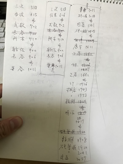 いつも通り、当該駅で降りるか乗るかすれば「下車」とするルールを適用するため、列車から降りた駅とは別の駅まで歩き、そこから列車に乗って駅数を稼ぐ。しかし35駅もあると、得意の行き当たりばったりでは到底不可能なのできっちりプランニングをするのだが、これがなかなか難しい。書いては消して書いては消してを繰り返し、何とか作り上げたプランが右下の画像だ。ダイヤとか宿の関係がどうしても絡んでくるので大分難航した。というわけで、初日は三次0538発の列車でスタートする。早。