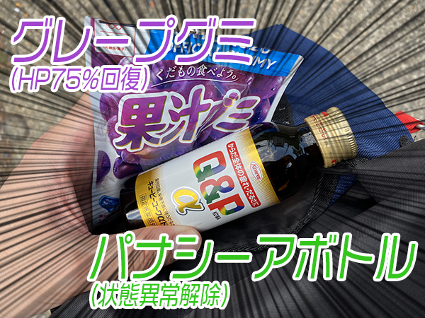 はいーこれがやりたかっただけー。知らない人のために言っておくと、グミとボトルはテイルズオブシリーズでお馴染みのアイテムなのである。オタクはね、形から入るのが好きなんだよ。グレープグミで体力を回復し、パナシーアボトルで状態異常(疲労)を解除する。う、うまい!